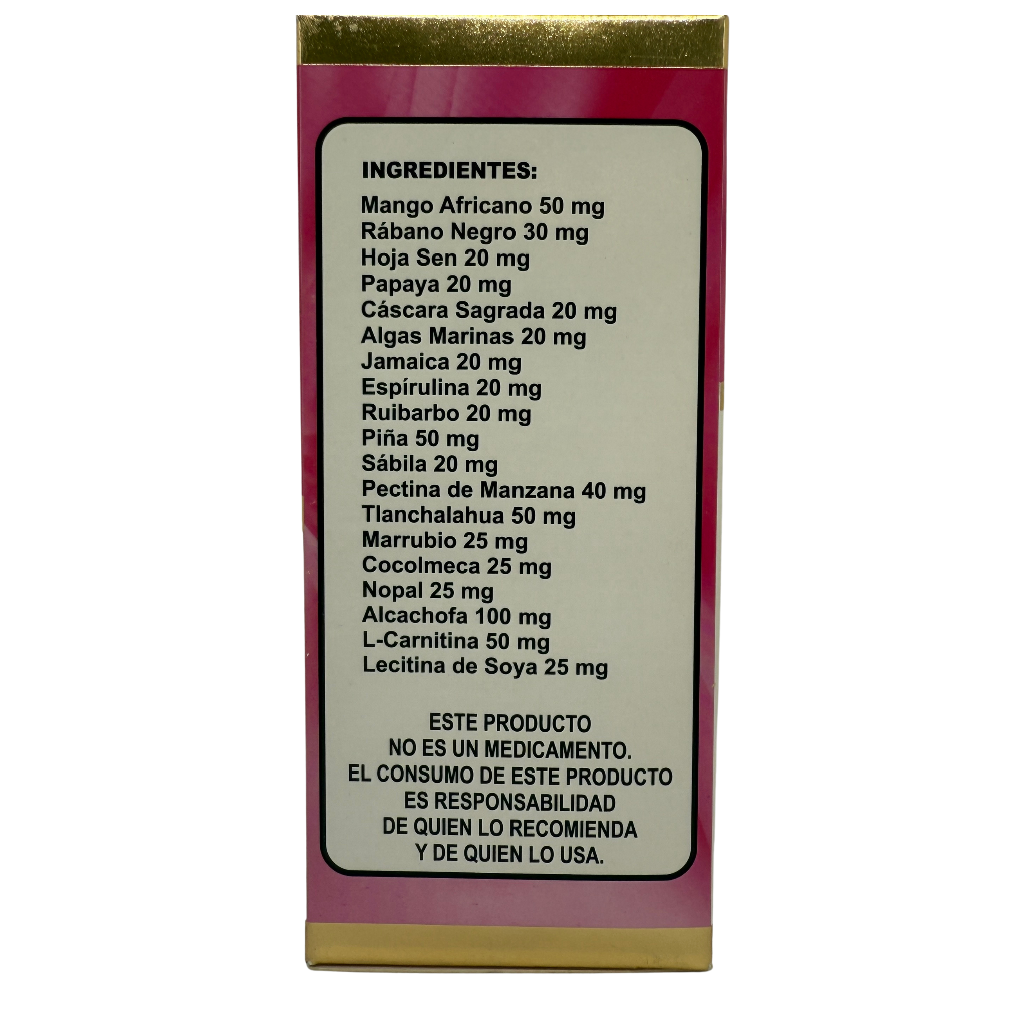 Ingredientes: Mango Africano, Rabano Negro, Hoja Sen, Papaya, Cascara Sagrada, Algas Marinas, Jamaica, Espirulina, Ruibarbo, Piña, Sabila, Pectina de Manzana, Tlanchalahua, Marrubio, Cocolmeca, Nopal, Alcachofa, L- Carnitina, Lecitina De Soya.